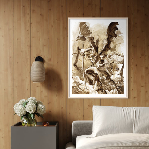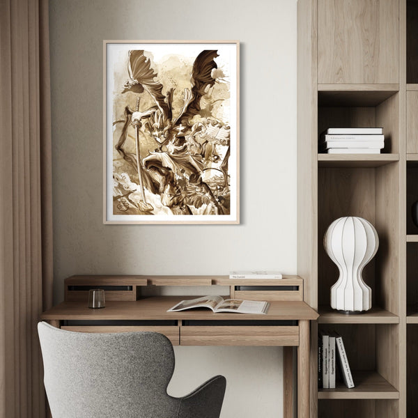 Using a single coffee tone, it conveys the dynamic energy of characters through variations in depth and shade.