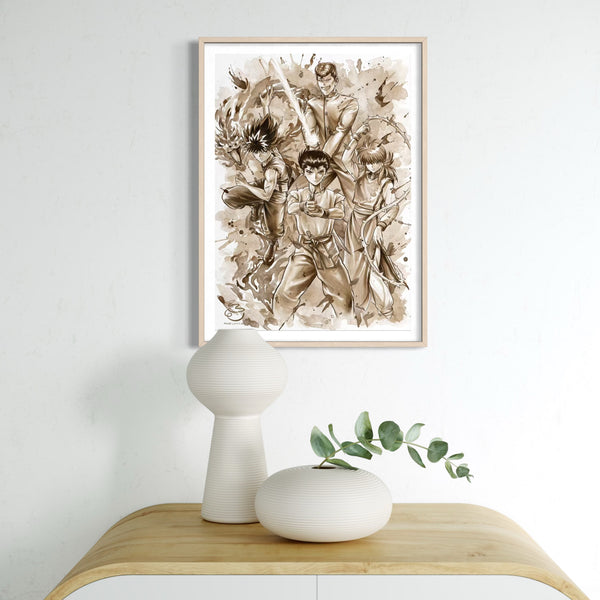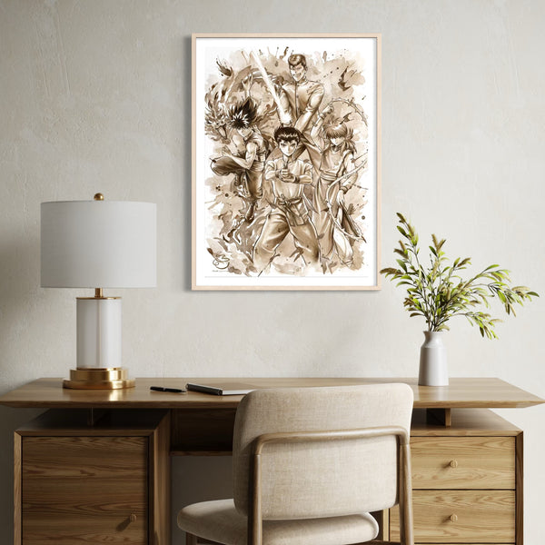 Using a single coffee tone, it conveys the dynamic energy of characters through variations in depth and shade.
